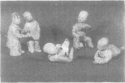 | 释义 | 陶塑釉彩泥孩儿南宋。江苏省镇江区五条街出土。江苏省镇江市博物馆藏。此为一组戏耍儿童,两人摔跤倒于地仍在嬉笑,身旁两儿童一坐一立助阵,另一儿童抄手观看。作者在儿童头部和脸部的塑造中抓住了儿童线条圆润、肉感很强的特点,个个活泼可爱。塑像上有“平江包成祖”、“平江孙荣”、“吴郡包成祖”等戳印,说明这些塑像出自苏州。苏州在隋代曾称吴郡,宋称平江府。这种泥孩儿像名“摩目候罗”从西域传来。宋时有“七夕”将它送给新婚之家祝愿生子的风俗。