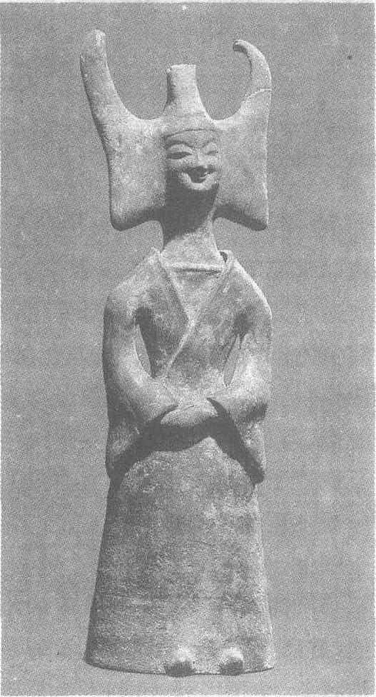 | 释义 | 陶女俑东晋。高37.5厘米。1960年江苏省南京市西善桥东晋墓出土。江苏省南京博物院藏。此女俑的发式富有特色,梳高大的双环髻,从正面看似两只动物的大角,十分有趣。着右衽长裙,仅露靴尖。衣袖为喇叭口。其发型和服饰是六朝时期贵族妇女的盛饰。女俑面容端庄娟秀,笑容温婉明丽,双手交叉于腹前,姿态优雅而沉稳,确具大家妇女的风采,是这个时期女俑中的优秀之作。