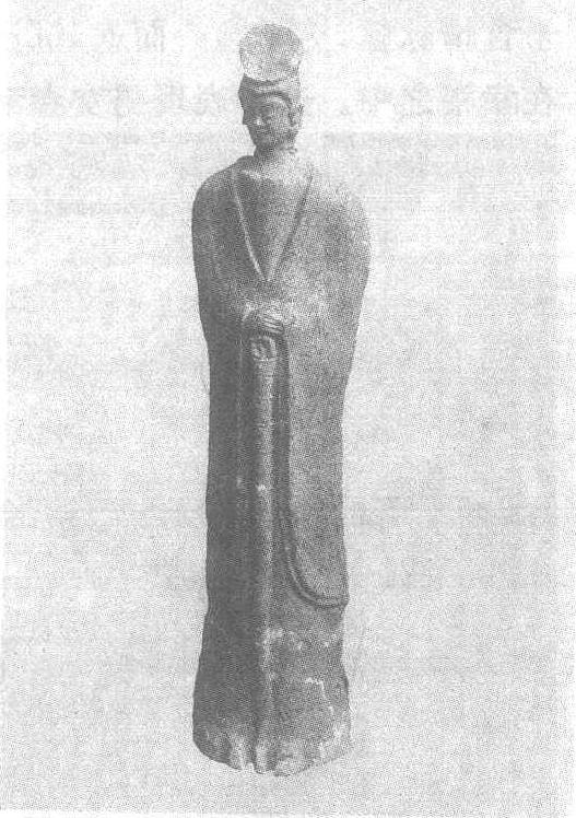 | 释义 | 陶武士俑北朝。高60厘米。江苏省徐州市狮子山出土。江苏省徐州市博物馆藏。此俑质地为泥制灰陶,头戴小冠,身着长裙,外罩长衫,目略下视,面带微笑,身前立一把环首刀,双手扶于刀柄上。此武士俑身材瘦长,虽然不尽符合人体比例,但夸张适度、合理。人物的线条流畅简洁,艺术感染力强。值得一提的是此武士俑的面貌并不凶猛威严,而是文质彬彬,颇为和善,风格独特,是这一时代陶塑艺术的珍品。
