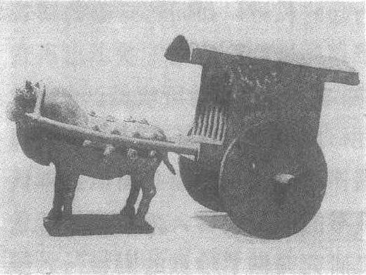 陶牛车明器。象征现实生活中的牛车。皆卷蓬车盖。1965年广西梧州市云盖山东汉墓出土的一件,车高11.5厘米、长16厘米,牛高9.4厘米、长17.3厘米。为长方形车箱,8辐车轮。车厢前有驾驭者催牛赶车。 |