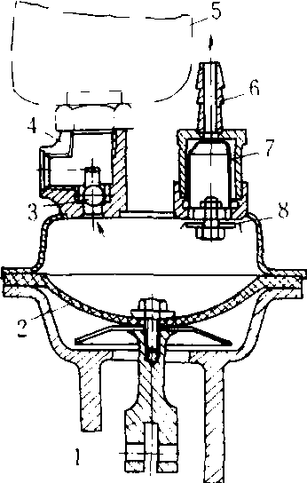 隔膜式液压泵 1.摇杆接头 2. 隔膜3. 出水球阀 4. 出水口接头5. 空气室 6. 进水管接头 7.滤网 8. 进水阀片 |