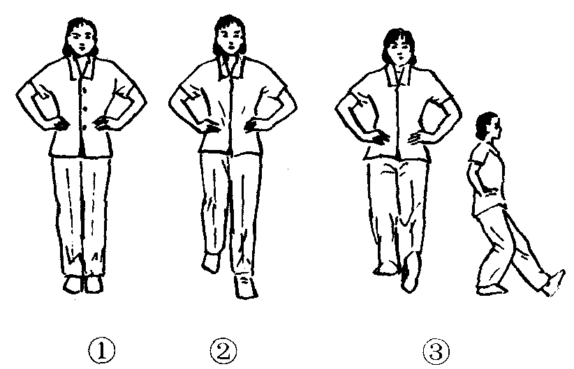 练功十八法第3套第6节。动作过程:双脚并立,双手叉腰,拇指向后。(图2—4—138—❶)❶左脚向前迈一步,随后身体重心移向左腿。(图2—4—138—❷)❷右脚跟落地,稍屈右膝,重心后移至右腿,左脚脚跟着地,脚尖朝上。(图2—4—138—❸)❸右脚向前上步,重心前移至右腿,左脚跟提起。❹左脚跟着地,左膝稍屈,重心后移至左腿,右脚跟着地。❺重心后移至左腿,左腿屈膝,右脚跟着地。❼左腿伸直,右脚后退一步,稍屈右膝,重心后移至右腿。❽还原成预备姿势。共做4个8拍。练习时要注意身体重心移动,虚实分明。此功法对于下肢关节不便、酸痛者有一定的治疗效果。
