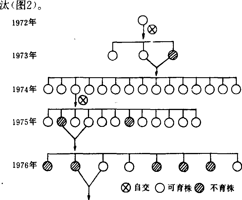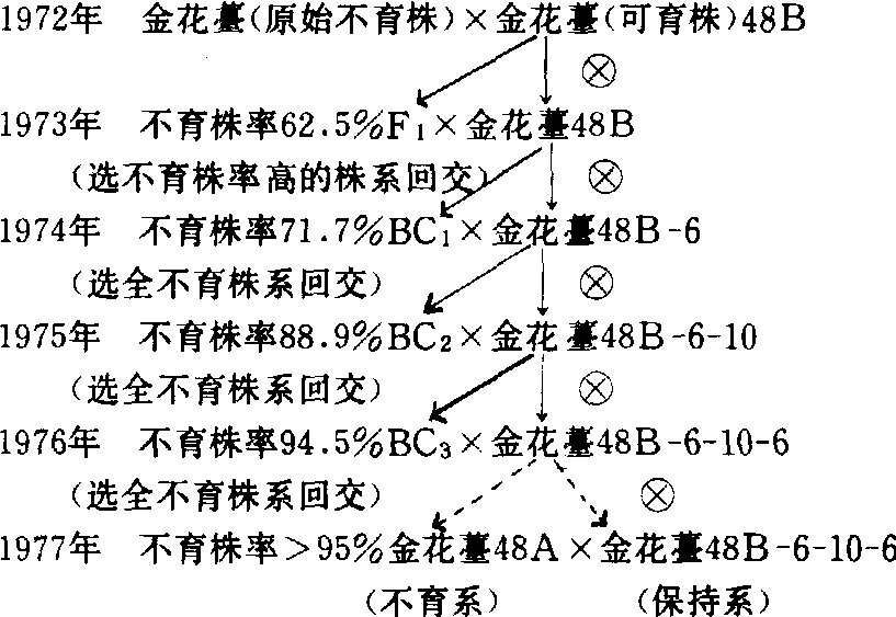 图 1 金花薹萝卜不育系48A和保持系48B的选育过程 如果用上述广泛测交、回交方法仍无法获得保持系,则应采用人工合成保持系的方法,即用不育株作母本,用几个优良可育材料作父本进行杂交,并将父本进行自交。第二代选择没有育性分离的F1作父本,以原父本为母本去雄进行反回交。第三代在BC1中选出4~5株作父本用原不育株作母本进行测交,父本同时自交。第四代选择育性分离组合,从相应父本中至少选出10株进行测交和自交。如果每个分离世代保持足够的群体,第五代在各测交后代中即可选出不育株率为100%的组合,即为不育系,其测交父本即为保持系。 对于核型雄性不育材料,当获得原始不育单株后先用同系或同品种材料进行测交。测交第一代有可能出现育性分离,也可能全部恢复育性。如F1恢复育性,则进行自交;如F1出现育性分离,则用不育株作母本,用系内可育株作父本进行姊妹交。测交组合数应大于4个,每一组合后代观察数应大于10株。以后各世代均按上述方式进行处理。连续两代出现育性分离,选育即告成功。连续两代不出现育性分离的组合应予以淘