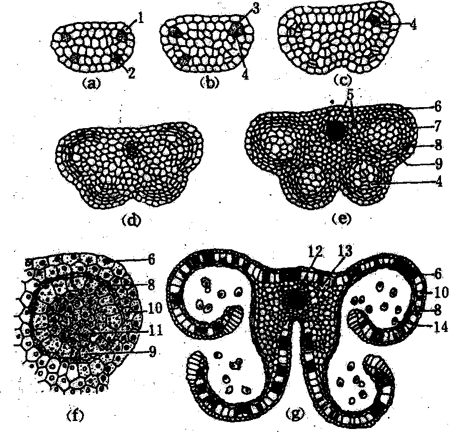 药室内壁 在表皮内方,通常为一层细胞。当花药接近成熟时,细胞径向延长,除外切向壁外,细胞壁发生条带状加厚,故药室内壁又称纤维层。在同侧两个花粉囊交接处的药室内壁是薄壁细胞,花药成熟时,药室内壁失水,花药在抗拉力弱的薄壁细胞处裂开而散出花粉。花药孔裂的植物以及一些水生植物、闭花受精植物,其药室内壁不发生带状加厚壁。 中层 为1至数层细胞。在花粉母细胞减数分裂早期,常被挤压破坏。但有些植物如百合的成熟花药内,尚可见到几层中层,其细胞壁也发生条带状加厚。 绒毡层 是花药壁最内层细胞。细胞大,细胞质浓稠,细胞核大。常常是二核或多核,也可能是多倍体或多线染色体。有腺质绒毡层(分泌绒毡层)和变形绒毡层(周缘质团绒毡层)两种类型。在被子植物中,腺质绒毡层比变形绒毡层更普遍。腺质绒毡层始终保留在原来位置,通过细胞内表面分泌各种物质,供应花粉发育的需要。当小孢子母细胞减数分裂完成后,绒毡层细胞开始出现退化迹象,到小孢子后期或雄配子体阶段,绒毡层细胞完全解体。变形绒毡层,细胞的内切向壁及径向壁较早破坏,原生质体流入药室中,并互相融合成为多核的周缘质团,存在于小孢子母细胞或正在发育的小孢子之间。一般在小孢子后期或雄配子体早期,周缘质团被吸收殆尽。在成熟的花药内,花药壁仅剩下表皮和药室内壁。在腺质绒毡层内切面上分布有许多颗粒状的鸟氏体或称球状体,是由绒毡层细胞质所形成,其直径约几个微米,在发育后期,往往形成复合的集合体。鸟氏体外被孢粉素覆盖,有厚的具孔道的壁,壁上有时有瘤状突起或刺。有人认为鸟氏体与花粉外壁的形成有关,是转运绒毡层合成的孢粉素至花粉粒的一种机制。在腺质绒毡层内切向壁上,覆盖着一层抗乙酰解的膜,包围药室内全部的花粉粒,此膜称绒毡层膜,来源于绒毡层细胞的分泌物。变形绒毡层的外切向壁上也形成性质类似绒毡层膜的膜层,称外绒毡层膜。有些具腺质绒毡层的植物,可同时具有外绒毡层膜,如百合属植物。绒毡层膜有何功能,尚不很清楚。有人推测此膜对发育的小孢子起“培养囊”的作用。有人认为绒毡层膜的主要作用是保持鸟氏体于药室壁上,在花药开裂后,以利花粉的散布。 绒毡层对花粉发育有多方面的重要作用: ❶在花粉母细胞减数分裂时,可能有运输营养物质至药室的功能; ❷能合成胼胝质酶。适时分解小孢子四分体的胼胝质壁,使各个小孢子互相分离而保证正常的发育; ❸合成蛋白质运转到花粉壁,构成花粉外壁蛋白质。在花粉与雌蕊的相互作用中起识别作用; ❹提供构成花粉外壁的孢粉素物质; ❺成熟花粉粒外表的花粉鞘和含油层均由绒毡层分泌的物质形成; ❻绒毡层解体后的降解产物,可作为花粉合成DNA、RNA、蛋白质及淀粉的原料。 花粉的发育 花粉发育的全过程包括小孢子的发生和雄配子体的形成。 小孢子的发生 在花药壁发育的同时,初生造孢细胞分裂形成许多花粉母细胞。花粉母细胞的细胞较大,多边形,核大,细胞质浓稠,排列紧密,有胞间连丝相互联系。减数分裂开始,花粉母细胞逐渐积累胼胝质(β-1,3-葡聚糖)壁。胼胝质壁存在于初生壁与细胞质膜之间,其上有很多小洞,直径约1~2μm,有粗大的细胞质联络通过,有利于花粉母细胞之间内容物的交换。花粉母细胞细胞质的这种连续性,是与一个药室内花粉母细胞减数分裂紧密同步所致。花粉四分体及各小孢子之间也被胼胝质壁包围或相隔,一般无胞间连丝存在。胼胝质是低渗性的,起分子筛的作用,容许营养物质通过,但阻止大分子渗过,因而保持了减数分裂后基因重组与分离后的小孢子之间的独立性。花粉母细胞减数分裂时的胞质分裂有连续型及同时型两种方式: 前者两次核分裂均伴随有胞质分裂,即第一次分裂形成2个细胞——二分体,第二次分裂形成了四分体,此种类型多见于单子叶植物; 后者是第一次核分裂不伴随胞质分裂,形成一个2核细胞,无二分体阶段,而在第二次分裂形成4个核以后,才同时发生胞质分裂形成四分体,这种型式多见于双子叶植物。四分体的4个细胞的排列方式有几种,最普遍的是四面体形和左右对称形,此外还有十字交叉形、T形和直列式。一般单子叶植物的四分体多为左右对称形,而双子叶植物多为四面体形。有时一种植物也可有几种形式的四分体。 通常花粉四分体时期是短暂的,由于胼胝质壁的溶解,4个单核花粉彼此分开,游离在充满液汁的药室中。但有些植物的单核花粉在四分体内不分开而发育为复合花粉如香蒲属(Typha)、夹竹桃科、杜鹃科、萝藦科、灯心草科及兰科的一些属。萝藦科的某些植物,一个药室内的内部单核花粉联结成一团块称花粉块。有些植物的四分体互相结合成许多花粉小块,如含羞草科植物的花粉小块有8~64细胞,兰科的天麻,一个药室中有300~400个花粉小块,而每个花粉小块包含几百个甚至上千个四分体。 雄配子体的形成 从花粉四分体释放出的单核花粉有薄的细胞壁、浓厚的细胞质和中央位的细胞核(单核居中期,小孢子早期),以后随着细胞体积增大,细胞质液泡化,最后形成一个中央大液泡。细胞质成为薄层贴向细胞壁,细胞核也随之靠边(单核靠边期,小孢子晚期)。单核花粉有内外两层细胞壁及萌发孔或萌发沟。一般单子叶植物的花粉多数有一个萌发孔,而双子叶植物多数有三个萌发孔。单核花
