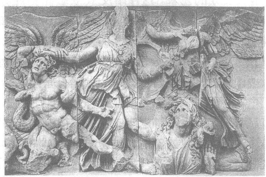 《雅典娜与巨人之战》是残存饰带之一,描绘了雅典娜制服巨人惊心动魄的戏剧性场面。在希腊神话中,大地女神该亚有一群巨人儿子,他们凭借大地母亲有着无穷的力量。可是,雅典娜在巨蛇和胜利女神的帮助下已经揪住巨人的头发并将他从地面提起,使之呼天不应,叫地不灵。他仰起头,作着最后的挣扎,近于夸大的双眼充满了绝望的痛苦。巨人的母亲——该亚,从地下涌出,拉着雅典娜的长裙发出祈求饶恕的哀鸣。我们看到,雕刻家对于激战高潮的把握和人物情绪表达以至人物心理的刻画都是十分成功的。这是希腊化时期雕刻家对希腊雕刻的卓越贡献。