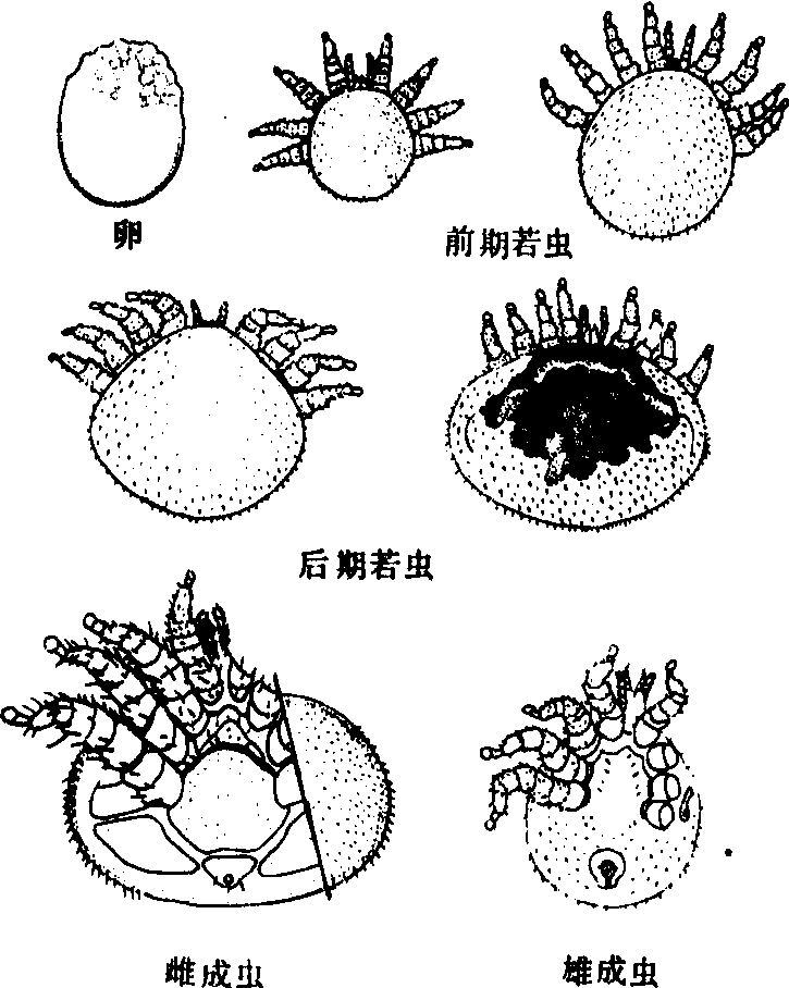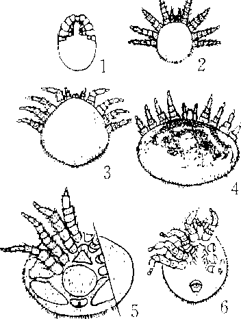 雅氏瓦螨 1.卵 2、3、4. 若螨 5. 雌成螨 6. 雄成螨 |