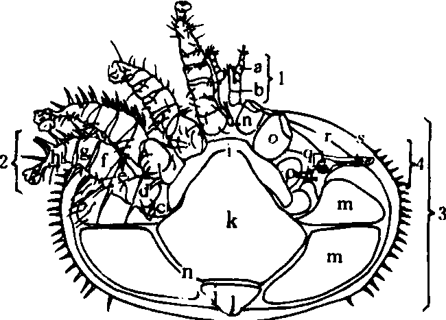 图1 雅氏瓦螨各期虫态 成虫 雌性与雄性形态不同。雌螨呈横椭圆形,宽大于长。体长1.1~1.2毫米,宽1.6~1.8毫米。棕褐色。背部明显隆起,腹面平,略外凸,侧缘背腹交界处无明显界线。有背板一块,覆盖体背全部及腹面的边缘,表皮3层,厚0.4~0.12微米,背盾区较厚,近颚体区较薄,约0.09微米;板上密布刚毛,后半部刚毛较长且卷曲,下有一层薄的真皮。腹板由数块骨片组成。胸板略呈新月形,具针状刚毛5对。生殖腹板呈五角形,其上有刚毛100余根。肛板呈倒三角形,宽大于高;肛孔位于肛板后半部,肛孔周围有3根刚毛。足内板和足后板发达;足后板略呈三角形,上有多根刚毛。腹面内缘两侧各具粗刺状刚毛19根。足4对,粗短强健。足的背部均具有两列长刚毛,第一至第三对足腹面亦有成列的刚毛,第四对足仅在各关节处有长针状刚毛。每只足的跗节末端均有钟形的爪垫(吸盘)。前足具感受化学物质的器官(嗅觉器),其上具不同形状和大小的感觉器。 雌螨颚体着生于身体腹面的前端,颚体具须肢一对,位于颚体前端两侧,呈长棒状,因基部与颚基愈合,仅见转节、股节、膝节、胫节、跗节。跗节内侧有一二叉叉毛。两颚体基部之间形成一硬化的纵沟,颚沟。转节基部腹内侧有一感觉器,称为须节转器。螯肢1对,着生于颚体背面内侧的小窝内,可以伸缩。螫肢不呈钳形,定趾退化。动趾尖锐,似刺针,横切面呈长棱形,具有锐利的两个齿,上下刃为薄而锐利的骨片,适于刺吸。口器由口下板、下咽、上唇、涎针等组成。口下板一对,位于颚基腹面内侧向前突出,呈三角状。颚角在口下板外缘前方,呈角状。下咽突出于口下板的前方,颚角之内,分左右两叶,端部边缘呈齿状。上咽亦称上唇,位于下咽背面,舌状,边缘具纤毛。涎针位于口下板与须肢之间,为一对狭长而骨化较弱的须状构造。头盖为颚基背壁向前延伸的膜质物。 雄螨躯体卵圆形,长0.8~0.9毫米,宽0.7~0.8毫米,有背板一块,覆盖体背全部及腹面边缘。背板边缘部的刚毛长,中部的短,末端不弯曲,刚毛排列无次序。在体背两侧最宽处有10~14对短棘状刚毛。腹板由数块骨片组成,各板除肛板明显外,其余各板几丁质化弱,界限不清。雄性生殖孔位于第2对足基节之间胸殖板前缘。肛板盾形,肛孔位于肛板后半部。接近肛孔前缘有一对肛侧毛,肛后有数根刚毛。足4对,形态结构与雌螨相似。