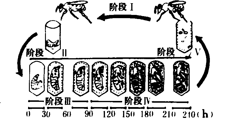 图2 雅氏瓦螨的形态构造 解剖构造 雅氏瓦螨体内有神经系统、消化系统、呼吸系统、生殖系统、排泄系统和肌肉组织等。 神经系统 高度集中,神经节或脑横椭圆形,长2.04~2.95微米,宽1.93~2.14微米,位于躯体前部腹面中央,包括食管上神经节和食管下神经节,由围食管神经连接。分出一对前神经(颚须肢神经),一对后神经(内脏神经),4对足神经干及神经分枝。 消化系统 包括咽、食管、有3对盲囊的中肠、胃、小肠、直肠。食管穿过脑以后弯曲前伸到达胃。胃的一对前盲囊伸到脑的背部前面;后盲囊伸到躯体后部。胃下连到后肠,有一直肠瓣将它与直肠分开。直肠末端形成肛囊,开口于肛门。 排泄器官 躯体两侧各有一条马氏管,与肠道平行,盲端到达胃部,另一端开口于直肠。 生殖系统 雌螨生殖系统包括一个香蕉形卵巢、输卵管、阴道和阴道口。阴道口(生殖孔)开口于生殖腹板下面靠前端。卵巢背面有一受精囊。卵巢两侧各有一条隙状器(lyriform organ),向前延伸到躯体前部。雄螨生殖孔位于第2对足的基节之间胸殖板前缘。 呼吸系统 身体两侧均有气管干,其分枝到达各内部器官;外端呈囊状的气门室,气门位于第3对和第4对足基间外侧,气门可以开闭。气门片遮盖气门,远端形成一条弯曲的盲管,不附着在表皮上,可以自由摆动,因而可以适应不同的生活条件。在巢房内有高浓度的二氧化碳,寄生在蜂体上飞翔时,有大量的氧。雄螨的气门管较短,不规则形,呈游离状态。 肌肉组织 额区有通向颚体、螯肢、以及口器的肌肉。前半体内有4对足屈肌,后端固着于前侧片(腹内骨)下。另有一束前侧片悬肌,一端连在前侧片,另一端连在表皮上。背腹肌束横着分散在躯体两侧至末体后端。体腔其他部分富于连结组织和变形细胞。 脂肪体 体腔内较大的脂肪细胞,中央有一细胞核和多个核仁。 瓦螨无血液循环系统,体液循环是腔隙的,体腔内和各器官之间富于连结组织,其中许多细胞是变形细胞。 生活史和习性 雅氏瓦螨在中国南方全年都能在蜂群中繁殖, 在中国北方随蜂群以成螨在蜂体、蜂箱中越冬。雌螨卵经24小时孵化为6足的幼虫,经48小时左右变为8足的前期若虫, 在48小时内蜕皮成为后期若虫, 再经3天变成成螨, 整个发育期为6~9天。雄螨整个发育期为6~7天。工蜂幼虫巢房的封盖期为12天时,受精的雌螨一次进入其中,最多能产3只受精的幼雌螨。雄螨交配后不久即死于巢房内。雌螨在夏季可生存2~3个月,在冬季可以生活5个月以上。 瓦螨有很强的生存能力和耐饥力,在脱离蜂巢的常温环境中可存活7天;在15~25℃,相对湿度65~75%的空蜂箱内能生存7天;在巢脾上能生存6~7天,在未封盖幼虫脾块上能生存15天,在封盖子脾块上生存32天; 在死工蜂、雄蜂和蛹上生存11天, 在-10℃~30℃下能存活2~3天。 一只受精的雌性雅氏瓦螨在一个产卵周期,在工蜂幼虫巢房可产1~5粒卵,在雄蜂幼虫巢房可产1~7粒卵。但在蜜蜂羽化时能够发育成熟的后代雌螨只有2~3只。雌螨在一生中有3~7个产卵周期,最多可产30粒卵。 瓦螨喜寄生于雄蜂幼虫,在雄蜂幼虫巢房蜂螨的寄生率比在工蜂幼虫巢房高5倍以上。这是因为: ❶雄蜂幼虫体内的脂肪酸酯较多。在蜂幼虫的10种酯肪酸酯中,棕榈酸(十六烷酸)甲酯、棕榈酸乙酯和亚麻酸甲酯在32℃下对瓦螨有高度吸引力。 ❷雄蜂幼虫比工蜂幼虫营养丰富。 ❸瓦螨生殖率与蜜蜂血淋巴内的保幼信息素的含量呈正相关,雄蜂幼虫血淋巴的保幼信息素含量较高;夏季蜂的含量高于冬季蜂。 ❹雄蜂幼虫的封盖期比工蜂幼虫长两天,瓦螨可以有较多的后代成熟。瓦螨最适的生活温度是蜂巢的育虫温度,即30~34℃,低于或高于这个温度蜂螨就不能繁殖。 雅氏瓦螨的生活周期可分为在蜂体上寄生期和在蜜蜂封盖巢房内进行繁殖两个时期。整个生活周期又可分为以下几个阶段。 第Ⅰ阶段: 雌性雅氏瓦螨随羽化的蜜蜂出房,寻找一只工蜂或雄蜂寄生其上,用口器刺破蜂体的节间膜,取食蜜蜂的血淋巴,并随蜜蜂在蜂巢内外漫游。延续时间约4~13天(图3)。大龄雌螨在巢外漫游时间较短。约有22%的雌螨进行第2次生殖,有更少的雌螨生殖3次以上。