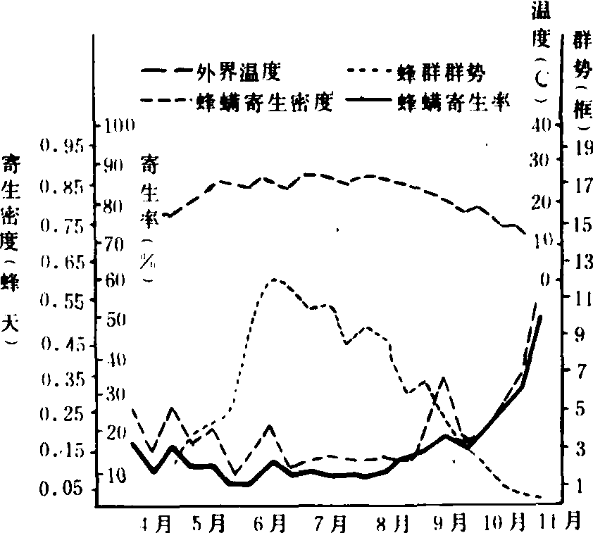 图3 雅氏瓦螨在工蜂房内的生活史(图下一行数字指巢房封盖后的小时数) 第Ⅱ阶段: 雅氏瓦螨经过一段漫游期后,从蜂体上脱落, 在巢房被封盖前不久进入5~5.5日龄工蜂幼虫巢房, 或进入5~7日龄雄蜂幼虫巢房。一只或多只雌螨进入一个巢房内, 钻入幼虫饲料中停止活动。这时瓦螨可能由于缺氧或高浓度的二氧化碳而麻痹。这种行为有利于瓦螨的繁殖。如果瓦螨在未封盖的巢房内活动, 在哺育蜂饲喂幼虫时就能爬到哺育蜂体上被带出巢房。东方蜜蜂发觉后即咬杀清除进入巢房内的瓦螨。这一阶段的延续时间为工蜂幼虫发育期的第7~9天。 第Ⅲ阶段: 瓦螨取食和产下最初两粒卵。巢房封盖后,蜜蜂幼虫吃光剩余的幼虫饲料,吐丝作茧,进入预蛹期。如果幼虫饲料未被完全消耗,蜂螨生长即受到限制,通常不久死亡。在正常情况下,在幼虫饲料吃光以后,雌螨从僵硬状态苏醒,爬到蜂幼虫或预蛹体上,取食血淋巴。工蜂巢房封盖后,雌螨经60~64小时产下第1粒卵,然后再经30小时左右产下第2粒卵。产下的第1粒卵绝大多数是雄性(n=7),第2、第3粒卵绝大多数是雌性(n=14)。如果瓦螨在第Ⅲ、第Ⅳ阶段摄食不足,就可能不产卵或只产1~2粒卵。这一阶段的延续时间为未成熟蜜蜂发育的第9.0~12.75天,即工蜂幼虫饱食和巢房封盖后0~90小时,或雄蜂幼虫饱食后0~90小时。 第Ⅳ阶段:产下最后几粒卵和胚胎发生。雌螨在工蜂房内具有产5粒卵或雄蜂房内产7粒卵的能力。一只雌螨可能产生后代的数量与进入一个巢房的瓦螨数和巢房封盖期有关。有数只瓦螨进入同一巢房时,由于营养不足,有些雌螨不能产卵。 大部分欧洲蜜蜂的工蜂幼虫巢房封盖期为12天,一只雌螨通常可产5粒卵,但只有两只后代(一雄一雌)成熟。在封盖期为14天的雄蜂房中,可以产生高达5只雌螨后代(平均2.7只)。非洲的海角蜂工蜂房的封盖期为11.1天,受感染的巢房中只有不足1/2的瓦螨能产生成熟的雌性后代。在中国广东省夏季,中蜂工蜂幼虫的封盖期平均只有10天(240~244小时),这也是中蜂受螨害轻的一个重要原因。这一时期的延续时间是从蜜蜂幼虫发育的12.75天到蜜蜂发育成熟,即工蜂幼虫饱食和封盖后90小时至羽化,雄蜂幼虫饱食后90小时到羽化。 第Ⅴ阶段:瓦螨成熟和交配。在封盖的幼虫巢房内,成熟的雄螨与成熟的雌螨交配。如果一个巢房内只进入一只雌螨,则幼雌螨行近亲交配;进入两只以上雌螨时,后代雌螨就可能发生远亲交配。延续期从巢房封盖后的240小时到成蜂羽化出房。 消长规律 瓦螨数量在春季最少,蜂群数量增长期其数量稳定上升,初秋数量最多。寄生密度(每百只蜂体上寄生的瓦螨数)与蜂群群势成负相关。在北京郊区3月中旬左右,蜂群开始活动和蜂王恢复产卵以后,瓦螨即开始繁殖。到4月下旬,螨的寄生率可达到15~20%,寄生密度可达25%。入夏蜂群进入发展盛期,自6月中旬到8月中旬,螨的寄生率和寄生密度分别为10%和15%左右,保持相对的稳定状态。8月下旬以后,由于气温逐渐降低,蜜源减少,蜂群群势下降,蜂王产卵量减少,最后停止产卵,螨的寄生率急剧上升。到11月初,进入蜂群越冬期以前,螨的寄生率和寄生密度均达最高峰,分别为49%和55%(图4)。由于蜂巢中的温度比较稳定,外界气温的变化对螨的繁殖只有间接关系。 根据瓦螨在一年中的消长情况,在夏末、晚秋和早春防治瓦螨,对于保证蜂群的发展、采蜜和抑制瓦螨的秋季爆发有重要意义。