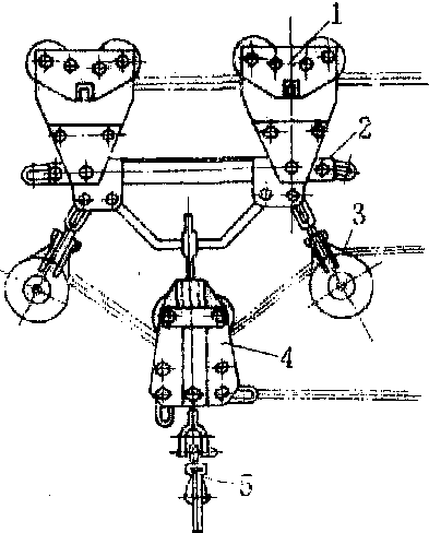 图2 简易增力式跑车1.小车;2.联结杆;3.定滑车; 跑车 为索道的主要设备,种类较多。❶简易增力式跑车(图2):一对小车用联结杆连起来。每个小车上有两个可在承载索上滚动的走行轮和可以使它通过中间鞍座的开口墙板,并在前后墙板间安装有防止从承载索上掉下来的锁索器。联杆上联结有两个定滑车通过起重索,还有一个“凵”型托架,可挂住吊钩。吊钩与动滑车连在一起,当挂有木材的吊钩被起重索升至跑车的托架时,动滑车上的摆动钩就挂在托架上。这样,在跑车运行时,起重索不受力,从而可延长其使用寿命。卸材时,用起重索升起吊钩,摆动钩就自动脱开托架,而后放松起重索落下吊钩卸材。 ❷半悬式跑车:跑车分上、下两部分,中间用联结板连起来。上面有两个走行轮和两块防止跑车从承载索上掉下来的挡板。下面的机构是为回空集材索到伐区时而放置的。集材时,跑车与集材索呈30°以上的角度,集材索顶起活动轮,抬起联动杆,联动杆沿轴转动,带动顶杆,顶起挡板,释放摆动杆,集材索上的回空卡越过摆动杆。这样,集材时,木材即可保持半悬状态。卸材前,先回空跑车上行,使回空卡越过摆动杆后卸下木材,此时回空卡被摆动杆挡住,可保证有一段集材索拖至地面,之后用回空索将跑车回空至集材点。 ❸半自动化跑车:中国在60年代和70年代初期广泛应用这类跑车,有K2型、GS3型、金沙江型和岷山型。 ❹遥控跑车:欧美国家应用一些靠无线电指令动作的跑车,例如HR-300无线电遥控液压传动跑车。它的上部两个走行轮间有一套夹钳,靠液压系统传动夹住承载索,使跑车停在承载索上,跑车下部轴上装有收紧、起重和松拉3个卷筒。起重卷筒上顺时针缠着起重索,它的运动靠收紧和松拉卷筒的运动来带动。收紧和松拉卷筒上按相反方向缠着由动力绞盘机上引出的牵引索和回空索。回空卷筒回收回空索时,松拉卷筒顺时针向转动,带动起重卷筒同步转动释出起重索落地挂材。当绞盘机的牵引卷筒缠卷牵引索时,跑车内收紧卷筒逆时针向转动,带动跑车内起重卷筒同步转动回收起重索起重木材。而后继续缠卷牵引索(同时放松回空索)将木材拉至卸材点。在跑车内起重卷筒上设有制动器,靠无线电控制的液压系统操纵。 鞍座 索道线路较长时(超过300~500米),承载索挠度增大,载重跑车可能触地,因此线路上要增加托住承载索的中间鞍座。跑车通过鞍座时,其上部的锁索器张开。鞍座类型除有吊挂式直线鞍座外,还有转弯鞍座、星轮鞍座、双轮鞍座和分岔鞍座。 展望 架空索道的应用,使开发地形复杂、地势高峻陡峭林区的森林有了可能性和经济性,并为保持这些地区的生态环境提供了条件。在不发达国家中,宜发展结构简单、造价低廉、容易操作和易于拆转安装的索道类型;在一些人工林较多的国家,重点应发展轻型索道设备,以获得经济效益和生态效益;在发达国家,主要是减少人工劳动,向短距离、遥控和移动式索道方向发展。在中国应以发展前者类型索道为主,只是在道路网密度较大、经营水平较高的林区,可适当发展轻型移动式索道设备。 见架空索道集材。 |