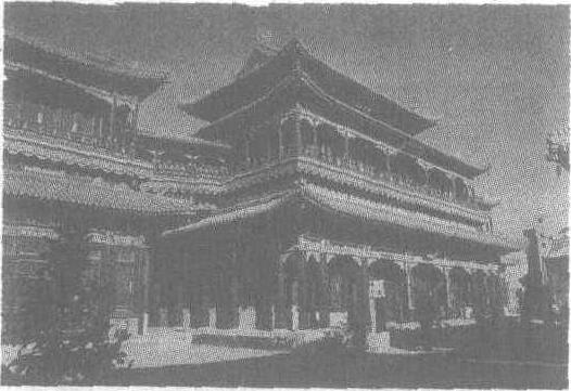雍和宫 雍和宫藏传佛寺。在北京城区雍和宫大街东侧。建于清康熙三十三年 (1694),当时为雍亲王府。雍正三年 (1725) 改为行宫,名雍和宫。乾隆九年 (1744) 改建为喇嘛庙。是中国内地最大的藏传佛教寺庙。占地66400平方米,布局严整,建筑巍峨壮观,充满皇家气派。主要建筑由三座精致的牌坊和五进宏伟的大殿所组成。两侧辅以配殿和顺山楼。法轮殿建筑别致,平面呈十字形,殿顶建有藏式风格的五座镏金宝塔。殿内供奉格鲁派 (黄教) 创始人宗喀巴大师。宗喀巴铜像背后是一座高3. 4米、宽3. 45米的紫檀木雕五百罗汉山,山峦洞穴雕造精美绝伦,神态各异的五百罗汉系用金、银、铜、铁、锡五种金属制作。这件罕见的艺术珍品与照佛楼内的楠木精雕飞云游龙绞大佛龛、万福阁内由整棵白檀木雕成,全长26米,地上18米,直径8米的迈达拉佛 (即弥勒佛) 立像,共称雍和宫之“三绝”。雍和宫大殿原为雍亲王府之银安殿,殿内供奉三世佛铜坐像,像高2. 8米,造型古雅端庄。东西两侧为十八罗汉塑像形态各异,栩栩如生。殿前御碑亭内立乾隆帝亲撰,用汉、满、蒙、藏4种文字合刻的《喇嘛说》石碑一通。东西两侧是药师、数学、讲经、密宗4配殿,是喇嘛们学习之所。万福阁又称大佛楼,是雍和宫最后最高的一座大殿,全部木构,黄瓦歇山顶三层楼阁,重檐垂脊,风格独特。与左右并列的永康阁、延绥阁以悬空阁道相通,联为一体,成为一组宏丽轩昂的建筑群。阁内供奉著名的迈达拉佛。雍和宫内还珍藏着大量珍贵文物及佛教经典。该寺为全国重点文物保护单位。