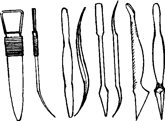 | 释义 | 雕塑刀雕塑家工作时最好、最方便的工具是自己的双手。用大拇指、食指或手掌。仅此是不够的,还需借助各种雕塑刀。它们实际是手指的延长,辅助手的不足。特别做眼耳及其他细小手指不宜伸至的地方则必用工具。因此雕塑刀形状类似手和手指。这些工具,雕塑家多根据需要自己动手用木、竹、金属等材料制作,造型如图。