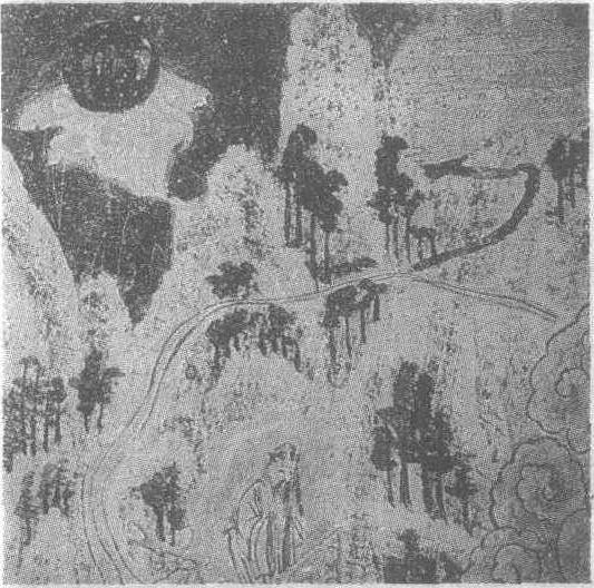 | 释义 | 雪山人物图壁画五代。甘肃省肃北蒙古族自治县五个庙石窟第1窟南壁东侧壁画。此为“普贤变”中的背景。画面上红日高高升起,峻峭的山岭被白雪所覆盖,林木郁郁葱葱,一条蜿蜒的小路通向远方的建筑。建筑物规模宏大,山腰处一老者向下眺望,双手合十。整个画面具有一种清寂冷峻之美,以世俗的眼光看,人物也随之具有孤独感。此图运笔豪迈、粗犷,意境表达深远,人和自然结合得恰到好处。
