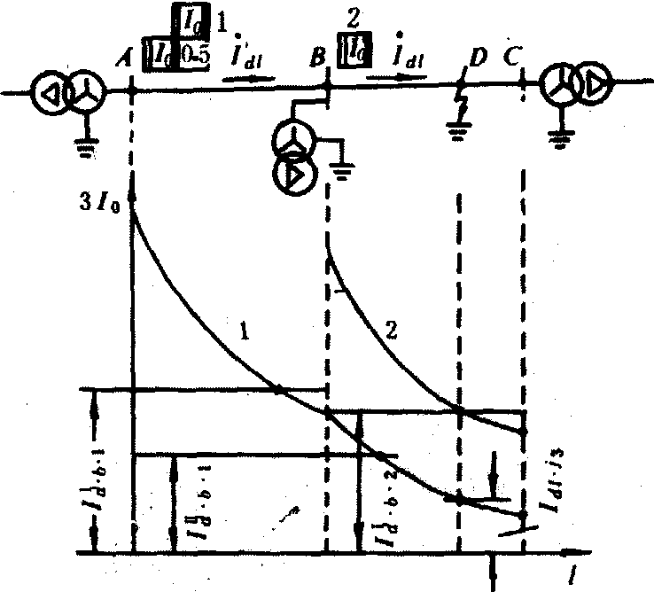 图1 零序电流保护动作特性 零序Ⅱ段保护的灵敏度Klm,按被保护线路末端接地短路时的最小零序电流来检验,其值为: Klm=Ido·min/I″dz·0>1.5 为保证动作的可靠性,保护动作时限取为0.5秒。 零序过电流保护(零序Ⅲ段保护) 接地短路主保护的后备保护,装在中性点接地电力系统中的终端线路上,亦可用为主保护。动作电流按躲过下一段线路出口处发生短路时,出现的最大不平衡电流Ibp·max整定: I″′dz·0=K″′K·Ibp·max 式中 K″′K为可靠系数,取1.2~1.3;Ibp·max为不平衡电流最大值,其值为Ibp·max=Kfzq·fwc·I(3)d/nLH,式中,Kfzq为短路过程中非周期分量影响系数,当保护动作延时大于0.3秒时,取为1;fwc为电流互感器的10%误差系数,取为0.1;I(3)d·max为本线路末端三相短路时,通过保护处的最大三相短路电流;nLH为电流互感器变比。考虑时限的配合,零序Ⅲ段的时间比下一段线路零序Ⅲ段的动作时间长一个时限段△t,约为0.5秒。 方向性零序电流保护 是增加了方向元件(功率方向继电器)的零序电流保护。在中性点接地的变压器台数较多的双侧或多侧电源的复杂网络中,利用零序功率方向继电器,具有闭锁可能误动作的保护功能,以保证动作的选择性(图2)。图中d-1点发生接地短路时,方向元件可使保护2不误动。方向性三段式零序电流保护由零序电压、零序电流滤序器、零序功率方向继电器及三段零序电流保护继电器组成(图3)。