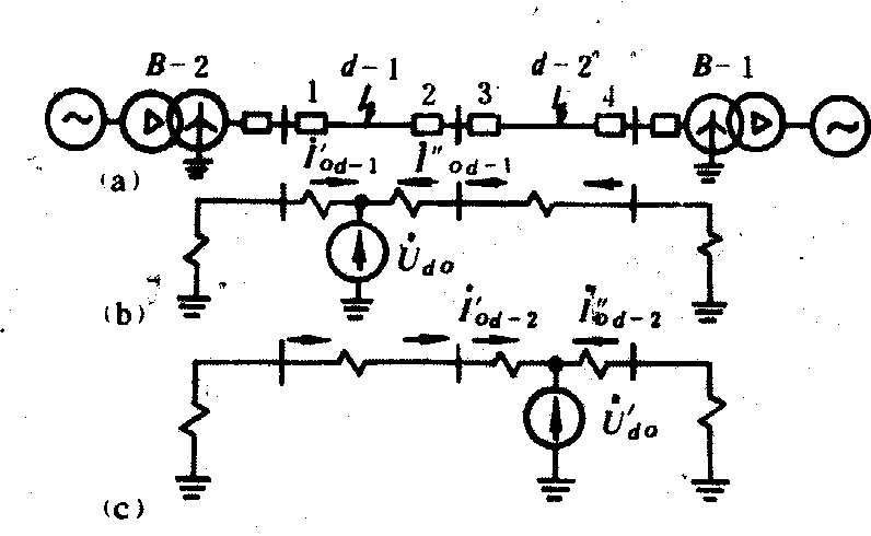 图2 零序方向保护工作原理 (a)网络接线; (b)d-1点短路的零序网络;(c)d-2点短路的零序网络