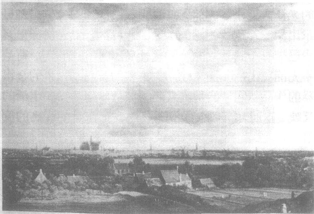 远望哈勒姆 雷斯达尔 荷兰风景画最引人注目的特色,是一眼望不到尽头的灰色地平线和银灰色的天空。风景中并无人的活动,立体感是通过树木、草地和积聚的浮云巧妙地构成的。同时,在荷兰绘画(这里指描绘户外景色的绘画)中,有一种显著的重视明亮部分的倾向。这种倾向也给予荷兰风景画以深邃的纵深感。雷斯达尔的作品,可以说正是带有这些所谓风景画的本质特征。