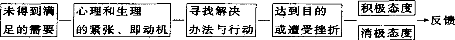 在上述模式中,人们未得到满足的需要引起心理和生理上的紧张,即产生一定的动机。这种动机导致消除紧张的解决办法和行为。行为的结果可能达到目的,也可能遭受挫折而未达到目的。无论是否达到目的,都可能产生积极态度或消极态度。积极态度包括达到目的后提出新的需要或未达到目的后采取积极适应的态度等; 消极态度包括达到目的后即满足现状不再上进,或未达到目的后采取撤退、攻击、取代、补偿、抑制、退化、迁怒于人或强词夺理等态度。这种积极态度或消极态度,以及是否达到目的的状况,均反馈回去,影响到下轮的需要。 西拉基和华莱士在1983年提出的一种模式如下图所示: