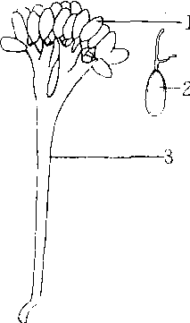 霜指霉属 1. 孢子囊 2. 萌发的孢子囊 3. 孢囊梗 |