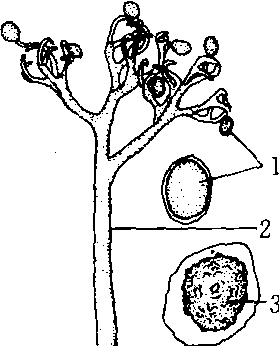 霜霉属 1.孢子囊 2.孢囊梗 3.卵孢子 |