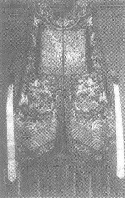 | 释义 | 霞披宋至清代后妃、命妇在祭祀、册封、朝会等重大典礼上穿的一种礼服。《事物原会》卷25谓:“在肩背,今命妇衣外以织文一服,前后如其衣长,中分而前两开方在肩背之间,谓之霞帔,即古之帔也。”霞帔是古时帔子的一种,最早出现于南北朝时,它的形式如披帛,惟质地较厚实,多以锦制成。绣有云凤纹样,上端较窄,绕颈部后垂于胸前,并在左右两下端各缀一枚圆形金玉饰牌,称“帔坠”。将帔身固定,不像披帛可随便飘曳。后人因其色彩艳丽,美如彩霞,故称为 “霞帔”。唐代诗人白居易在《霓裳羽衣舞歌》中就有“虹裳霞帔步摇冠” 的描写。宋代以后,霞帔定为后妃命妇的正式礼服、常服。据《宋史·舆服志》 载:“其常服,后妃大袖,生色领,长裙,霞帔,玉坠子; 背子,生色领皆用绛罗……” 霞帔是宋代贵族妇人的服饰,平民百姓只能佩戴无图纹的直帔。据《事物纪原》载: “今代帔有二等,霞帔非恩赐不得服,为妇人之命服; 而直披通用于民间。” 明代承袭宋制,并对霞帔形制有具体规定,据《明会典》载,洪武二十四年 (1391) 定: “霞帔二条,各长五尺七寸,阔三寸二分,各绣禽七,随品级用,前四、后三,各绣。临末左右取尖长二寸七分,前后分垂,横缀青罗襻子,牵联并之。前垂三尺三寸五分,尖缀坠子一,后垂二尺三寸五分,临末插兜子内藏之。坠子中钑花禽一,四面云霞文。禽如霞帔,随品级用。”后妃命妇的霞帔随品级也有严格区别。皇后常服“大衫霞帔,衫黄,霞帔深青,织金云霞龙文,或绣或铺翠圈金,饰以珠玉坠子,瑑龙文。” 皇妃礼服: “真红大袖衣,霞帔、红罗裙,褙子,衣用织金及绣凤文。”命妇礼服: “一品、二品,霞帔、褙子俱云霞翟文,钑花金坠子; 三品、四品,霞帔、褙子俱云霞孔雀文,钑花金坠子; 五品,霞帔、褙子俱云霞鸳鸯文,镀金钑花银坠子; 六品,霞帔、褙子俱云霞练鹊文,钑花银坠子; 七品,霞帔、坠子、褙子与六品同。八品、九品,霞帔用绣缠枝花,坠子与七品同,褙子绣摘枝团花。” ( 《明史·舆服志》)清代霞帔,形制有所改变。帔身放宽,阔如背心,加有后片及衣领,圆领对襟,前后两片两侧腋下用细带系之,前襟中间各以品级为别,缀以补子,帔角下部不用帔坠,改用彩色流苏,是诰命妇人的专用服饰。士庶妇女一生中只有两次可以穿著的机会,一次是出嫁之日,一次是在入殓之时,俗谓“假借”。