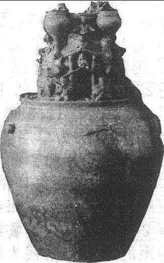| 释义 | 青瓷谷仓罐三国时期越窑产品。又称魂瓶。高41、腹径26.6厘米。胎质坚硬,釉面光亮,有细小裂纹。釉色为黄绿色,施釉至罐下部,挂釉不到底,淌釉面覆盖较大。上腹宽,直腹向下收,平底。上部堆贴繁复,意似谷仓。仓正面有上下两层门庭。上层有三犬守卫。下层有两人怀抱武器守于门两侧。其后有十人抱手于胸,围坐谷仓一周。罐口贴塑4个小罐,均敞口,鼓腹,底部沿仓体拖长。仓体部塑有21只小鸟,均作昂首向上展翅欲飞之状。罐肩部又有三羊坐卧,体态优美,长须飘胸。上腹有五孔、两蜥蜴从两孔爬出,一只龟和另一似龟形物向另两孔爬入,又一孔探出一蛇头。今藏旅顺博
