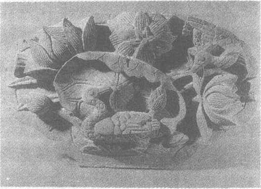 清。高24.5厘米。安徽省博物馆藏。青砖雕制。莲、荷间,一对鸳鸯正在尽情嬉戏:一只轻凫浪花上,扭头盯着同伴,引诱它前来追逐;另一只探头荷梗中,大大的圆眼紧看着对方,狡黠稚拙,生趣盎然,令人忍俊不禁。