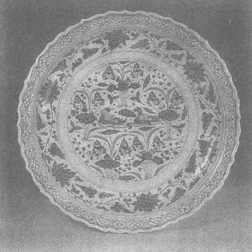 | 释义 | 青花鸳鸯莲纹瓷盘元。高6.7厘米,口径46.5厘米。北京故宫博物院藏。此盘菱花式口,折沿,圈足,砂底。以青料在盘内外绘画。盘外壁绘缠枝莲。盘内壁绘3层纹饰:口沿画锦纹一周;盘里画缠枝莲花六朵;盘心为主题纹饰,池塘内,水波荡漾,莲荷亭亭玉立,两只鸳鸯在荷叶间轻游,它们顾盼追逐,情话喁喁。画面风格清新,很有意境,显示出元代瓷器绘画已达到很高的水平。类似的大型青花折沿盘,元代景德镇曾烧制甚多。