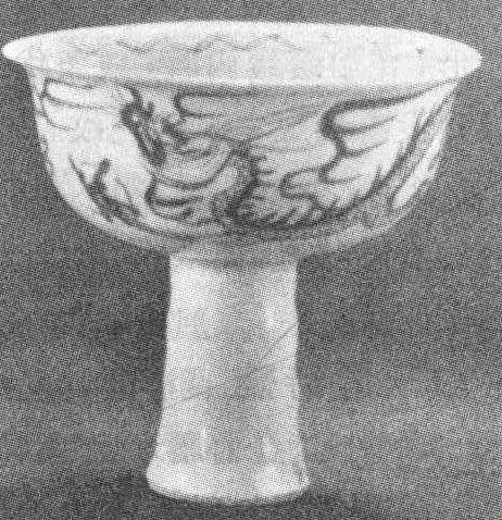 | 释义 | 青花龙纹高足杯元代青花瓷器,1978年4月内蒙古自治区赤峰县大营子公社元代窑藏出土。口径十一点五厘米,高十四点六厘米,足径三点八厘米。杯侈口,圆唇,腹微内收,足细高,饰三道凸弦纹,底足缘外侈。器身内外均施青花釉彩和印纹。内壁自上而下饰三组花纹:口沿部饰相互勾连的卷草纹;腹部为一条飞舞的龙纹;底部为一组圆形的变形蕉叶纹,蕉叶内填如意形云纹。外壁亦饰一条飞龙纹,并以火焰纹点缀其间。胎骨厚重,胎质较粗。该杯现被内蒙古自治区赤峰县文化馆收藏。