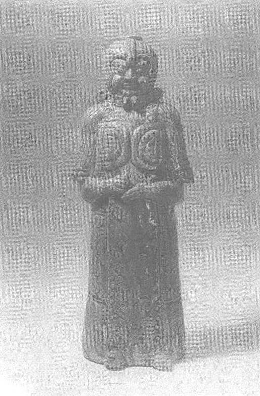 | 释义 | 青釉武士瓷俑隋。高59厘米。湖北省武昌出土。北京中国历史博物馆藏。此为古代为随葬而烧制的人物和动物模型,通称俑,始见于汉代。此俑做立式,头戴盔,身披半袖曳地军袍,颈系护带,上身着护胸。武士脸盘较圆,双目外凸,鼻孔张开,嘴角外撇,脸颊肌肉隆起。双手置胸前,一手半握拳,一手平伸,塑造得极为传神。武士的整体造型及各部位比例,虽尚未达到无可挑剔的水平,但其炯炯专注的双目,鼻翼掀动的沉重呼吸和发达隆起的肌肉,无一不透视出一位孔武有力的将士临战前的威武气势和艺术感染力。