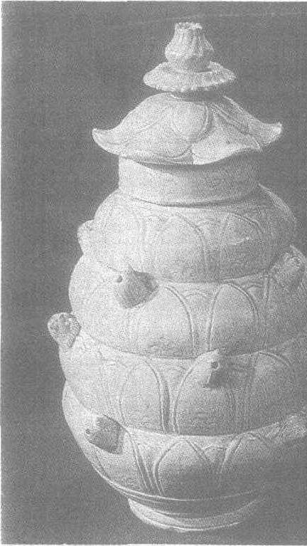 | 释义 | 青釉莲瓣多孔带盖瓷瓶北宋。通高33.3厘米,口径6.7厘米。北京中国历史博物馆藏。龙泉窑系产品。明器(即冥器,是专为随葬而制作的器物)。瓶体有3道束腰,12个凸出的插香孔,圈足,六瓣莲花形瓶盖上饰一花蕾形纽。器表按束腰分成的四部分剔刻四重莲瓣纹,莲瓣中饰如意头形卷云。造型奇特美观,釉色青中泛黄。