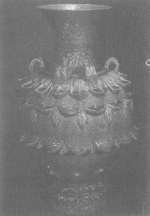 青釉莲花瓷尊北朝山东省淄博寨里窑青釉瓷器,1982年6月山东省淄博市淄川区龙泉公社和庄村东的北朝晚期墓出土。口径十三点一厘米。底径十六厘米,高五十九厘米,胎厚一点四厘米。形体高大,平唇,喇叭形口,长颈,椭圆腹,圈足较高微外撇。口部和颈部饰八道阴弦纹,肩部饰一周粗绳纹,下有四个弧形系,系之间饰四组模印宝相花纹,每组三朵,一大两小。腹上部饰堆塑的一周二十一个覆莲瓣纹,莲瓣凸起丰满肥大,瓣尖向外微卷。腹中部饰两周忍冬花图案,上周二十一组,下周十组。腹下部饰一组双层仰莲瓣纹,每层各十一瓣合成一周。腹以下收缩为向外微侈的圈足,足外堆塑一周十一瓣覆莲。整个装饰华丽精美,具有高度的艺术水平。该尊胎质较粗,呈灰白色,胎骨坚致;全器施青釉,釉层薄而均匀,釉色青中泛黄,光亮晶润。现藏于山东省淄博市博物馆。 |