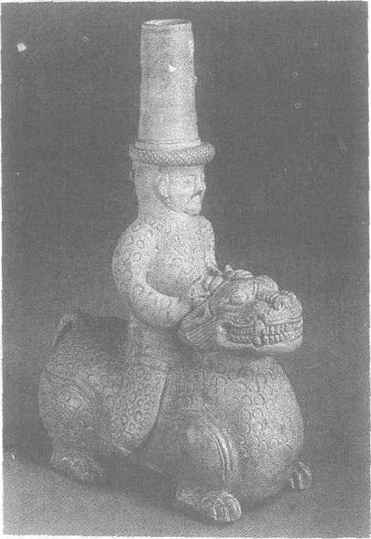 | 释义 | 青釉骑兽瓷俑西晋。高27.7厘米。北京故宫博物院藏。为六朝青釉器的典型产品。兽背骑一人,头戴高筒帽,帽沿做网纹卷沿形,身着圆圈纹衫裤。骑兽人坐于兽背的靠前部位,两腿紧夹兽之侧腹,双手扶兽首,目视前方,神态镇定自若,有稳坐泰山之势。所骑之兽类似辟邪,怒目突出,獠牙外露,貌极凶暴。但兽身的纹饰却与人的衣衫纹饰相同,因而淡化了兽的狰狞面目,缓和了人骑怪兽的紧张气氛。这种富有幽默情趣的造型构思,加之悦目的青中闪黄的釉色,使此俑显示出独特和巧妙,成为西晋时期青瓷的力作。