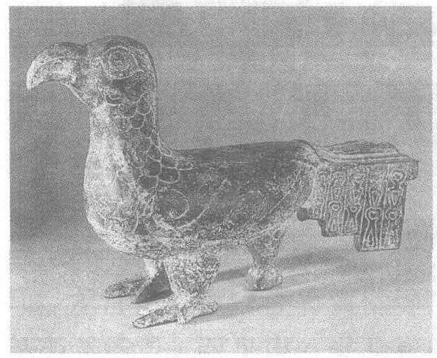 青铜三足鸟 这是一件充满了想像力的圆雕作品。以整体造型而言,浑厚古朴,简洁明快,具有一种稚拙美。鸟作伫立状,粗壮的双足于前,另一只兽形足在后,三足鼎立,十分稳定。在细部处理上,又不失对象的真实,如鸟的双目、双翼和尾部都以阴刻线纹刻画装饰。显然,这件鸟是以现实为参照,经过匠师的大胆想象、创造,赋予作品以生命力。这件作品以其可视的生动性,给观众留下了深刻的印象。周代雕塑已逐渐摆脱商代雕塑的神秘性,向着写实的方向前进。 |