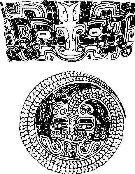 饕餮纹 (上) 龙纹 (下) 商代人们对自然界现象不认识,不理解,而产生祭祀天地山川,崇拜鬼神。反映在青铜器纹饰上,多属抽象、幻想的动物,给人以神秘、庄严、肃穆之气氛。在商代前期青铜器纹饰较简单,大都饰以单线条的饕餮纹,夹以圈带纹、乳丁纹和涡纹等。商代后期,流行繁缛花纹,主要表现以云雷纹为地纹,主题纹饰除饕餮纹外,还有蝉纹、鸟纹、龟纹、蛇纹等动物纹和各种几何形纹饰。花纹往往遍布器物全身。商末周初,社会动乱,天命观动摇,是西周青铜器纹饰变化的重要因素。此时已不是狂热的崇拜鬼神,而是较多地注意对祖先的祭祀,作器铸铭文,以颂扬先人的功德,宣扬夺取政权符合天命,以巩固政权。西周早期青铜器纹饰继承商代晚期的传统,西周中、晚期则多铸有长篇铭文。而青铜器纹饰则主要做为一种装饰趋向简化。饕餮纹逐渐失去主题纹饰地位,而下降为附饰。代之而起的是一种清新、流畅的风格。带状花纹增多,最常见的纹饰有鸟纹、窃曲纹、重环纹、波曲纹、瓦纹等。春秋战国之际,处于奴隶制向封建制过渡时期,在摆脱奴隶主阶级旧观念束缚下,无论从青铜器纹饰的多样性和构图的灵活性,都表明青铜工艺发展进入新阶段。青铜纹饰较前有了较大变化。商和西周青铜器上以对称的饕餮等兽面纹为主繁缛纹样已被淘汰,代之以动物纹、几何纹与人物活动图形等。如窃曲纹、贝纹、蛇纹、重环纹、云雷纹以及描写当时社会生活的采桑、狩猎、宴饮、水陆攻战纹等。镶嵌、鎏金、金银错等新兴青铜工艺的出现,使春秋战国铜器的装饰花纹更加富丽豪华。 |