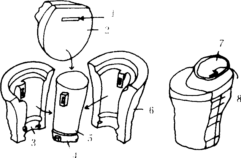 铸造车辔示意图 1.直浇口2.浇口杯3.泥心座4.泥心头5.内范6. 外范7.浇口杯8.直浇口 |
