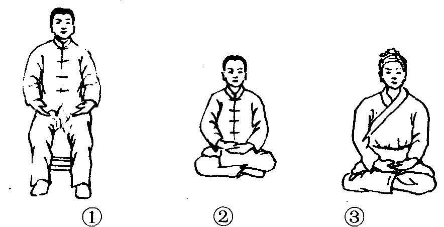 ❸)坐功时,要保持自然呼吸或腹式呼吸,呼吸要均匀缓慢细长,排除杂念,方法可采用重复数数或意守丹田。坐功完毕时,先想将气从全身毛孔放出,然后渐渐动身及舒放两臂,两手心对搓,抚摩面目,慢慢睁开双眼,将脚放平,手按摩足部,缓缓起身。练习静坐时要注意,宽衣松带,最好是一早一晚,安静时,并注意室内空气流通新鲜,又要避风。如在地上盘坐,可铺上被褥或垫子,臀部也可垫高1~2寸。初学者可先练习立坐或单盘,也可以只练一种;无论坐什么姿势都要身体保持正直,不可歪斜。时间开始在20~40分钟左右,逐渐延长到1小时。此功法最适宜年老体弱和行动不便者练习。