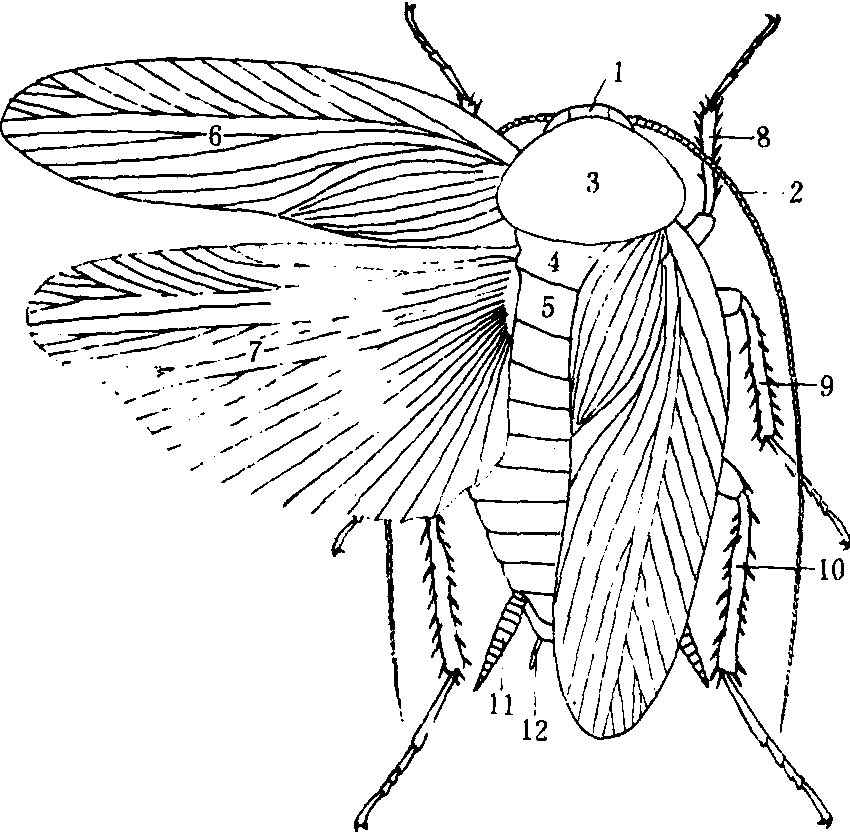 形态 如图2所示,体扁平,小至大型。体色黄褐、红褐至黑色。头部较小,隐藏于前胸背板下,活动自如; 单眼一对,复眼发达,肾形; 触角丝状。前胸背板发达,常为梯形或椭圆形;中、后胸形状类似,略为梯形或方形。足3对,常由前至后逐对增大,腿节粗壮,中、后足腿节下缘具刺列,或无刺列,或仅1~4个小刺,胫节细长,亦具刺列,跗节5节,有一对爪,中垫一般发达。翅通常两对,前翅革质,后翅膜质;有的前、后翅均退化或消失,有的雄虫翅发达,雌虫翅缺。静止时,前翅平置,左翅盖于右翅之上;后翅臀区或折叠成扇状,或平置,仅1~2折。翅脉多,翅面划分为4个区域:前缘域,径缘域,中肘域,臀域。前翅Sc脉退化,有时仅于翅基部略现痕迹,R脉及Cu脉分支多,Rs脉缺,M脉常较简单,A脉多。腹部宽扁,11节,通常见到背板10节,腹板9节。第一节背板甚短,第十节成肛上板,有分节尾须一对,第十一节退化,仅存痕迹;腹板第一节退化,最末一节成下生殖板,雄虫为第九节,雌虫为第七节(第八、九两节被第七节所覆盖);雄虫下生殖板上着生腹刺一对,雌虫无腹刺,这是雌雄鉴别的依据。第五至八节,其中的第一或第二节背板中央有背腺开口。雄性阳茎常是3个叶状突起,生殖孔位于阳茎叶的中间。阳茎叶的数目、形状可作分类依据。雌性产卵器及生殖孔藏在生殖腔内,产卵瓣有夹持卵鞘的功能。