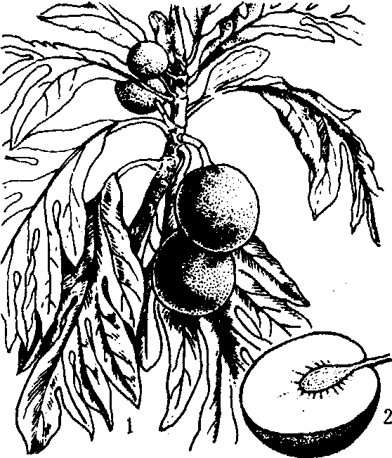 面包果 1. 果枝; 2. 果实纵剖面 面包果breadfruitArtocarpus altilis Fosberg,桑科,木菠萝属。常绿乔木。2n=54,56,81。原产印度尼西亚和马来西亚。热带各地有栽培,中国广东和台湾省有引种。高达20 m。叶片革质,羽状深裂,裂片末端尖。雄花序棒状,雌花密生成长圆形至圆形的穗状花序。果实为有刺头聚花果,圆形或长圆形,长10~20 cm,重约4 kg,成熟果实黄色;果肉纤维状,白色至浅黄色。栽培品种分有核和无核两类。果肉富含淀粉及蛋白质,切片烘烤可食,犹如面包。枝叶繁茂,树姿优美,可供观赏。