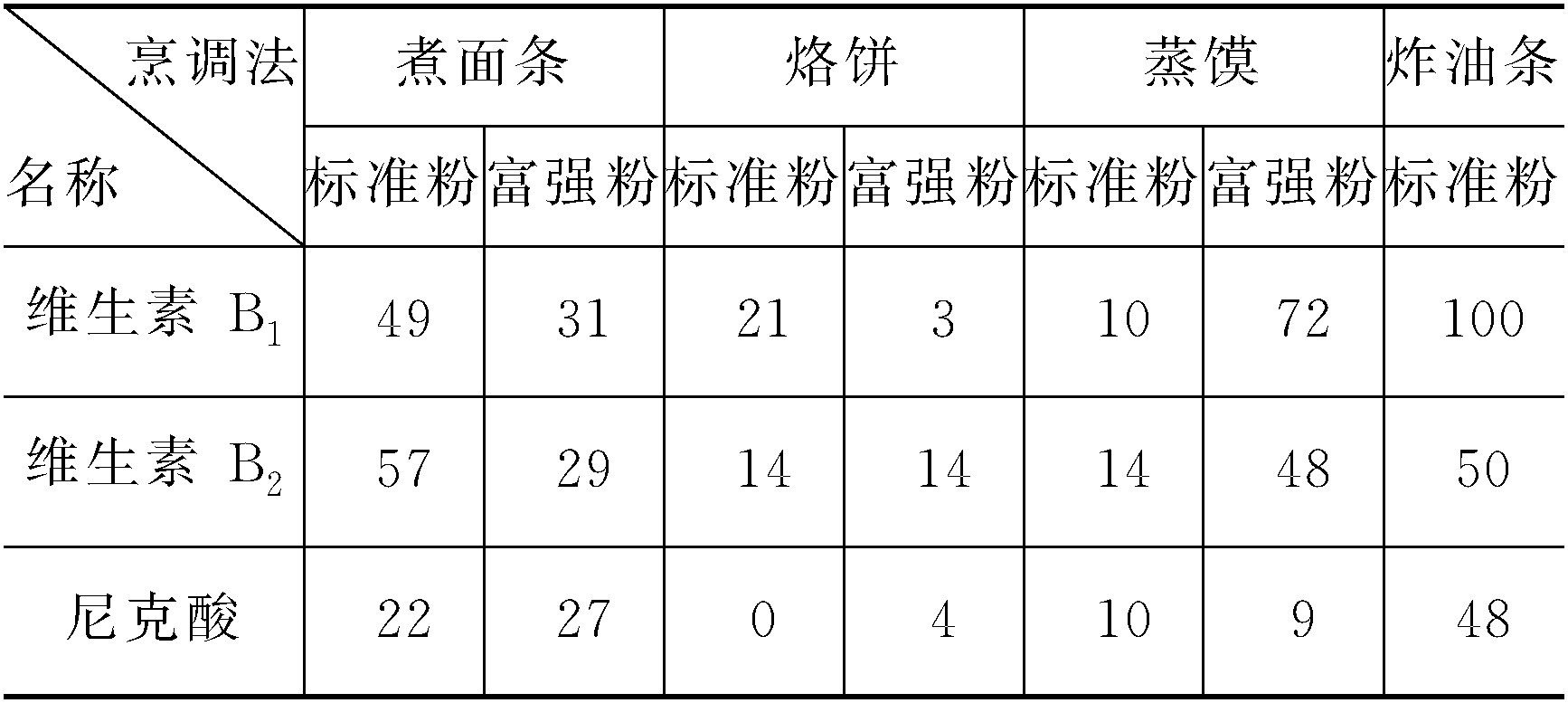 面粉烹调中B族维生素损失较大。下表是不同烹调法B族维生素的损失比较(单位:质量分数%):