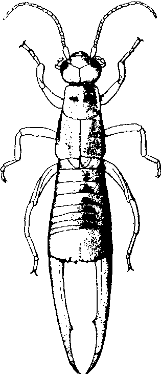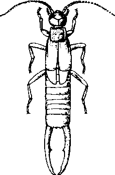 习性 每年1~2代。栖息于野外石下、浅沟中、枯枝落叶下或在树皮下与倒伏的树木上较潮湿的地方。夜间活动的种类多有趋光性。部分种类有群飞的习性。树栖种类在树皮下钻成简单的穴作巢,也有在室内栖息者。一般为杂食性,以其他昆虫与动物性干燥物质,或食植物的花、芽、浆果等为食,尾铗作防卫或攻击,猎取食物用。产卵前在地上掘孔,孔深一般40~60毫米。每雌产卵10余粒至90粒不等。雌虫产卵于土中后仍继续守护巢穴,以保护卵和幼小若虫。若虫经过4或5龄。 革翅目Dermaptera包括蠼螋和蝠螋。昆虫纲,有翅亚纲。中、小型,体长而扁平,黄褐至黑色,表皮坚韧、光滑。咀嚼式口器,前口式,触角丝状。前胸大,近方形。前翅短,角质,末端平截;后翅扁状,翅脉放射状;或无翅。足跗节3节。尾须铗状,无产卵器。渐变态。多为夜行性,白天伏于石块、树皮下或土壤、草丛中。杂食性。有的种类雌虫有护卵育幼的习性。本目已知1 000多种,中国已知70余种。常见种白角蠼螋(Anisolabis marginalis Borelli),为害贮粮及贮藏果品,鼠螋与蝠螋寄生于鼠及蝙蝠上,少数种为害蔬菜。