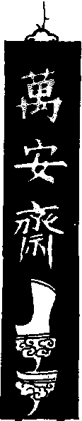 在一块涂有黑色的木牌上,用黄色书写“万安斋”三个字,并在下方画一靴一鞋。示意店内出售的产品。过去流行东北地区。