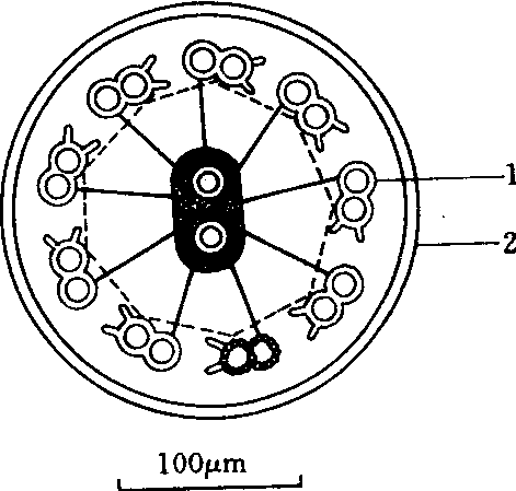 动体与细胞核之间有纤维状根丝体连接。与根丝体结构相同的条状小根,可延伸到细胞质中或核膜或其他细胞器中,如中心粒、第二动体或线粒体。单根微管是小根系统的一部分,将鞭毛固定于细胞结构上使活跃的鞭毛在运动时不会从细胞上脱落。在有的类型中,两个动体仅生出一个鞭毛,成为单鞭毛菌,因此有人认为单鞭毛菌起源于双鞭毛菌。鞭毛的形态、结构和数目在真菌的系统发育、亲缘关系和分类、演化上具有非常重要的意义。游动孢子除含有上述细胞器和内含物外,还含有线粒体、高尔基体、内质网、核糖体、核帽、脂肪滴、γ-粒、泡囊等(图2)。