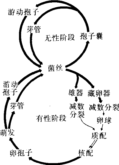 鞭毛菌的无性态还有芽孢、厚垣孢子和菌丝膨大体等。 有性态 鞭毛菌的有性生殖是通过同型或异型配子的结合、异型配子囊的接触和菌丝体的结合交配,经质配和核配,最后形成休眠孢子囊或卵孢子。鞭毛菌的有性生殖常受生理的控制和环境条件的影响,如温度、水分的变化和营养物质的匮乏影响有性孢子的形成。