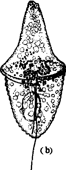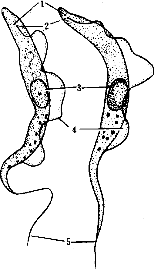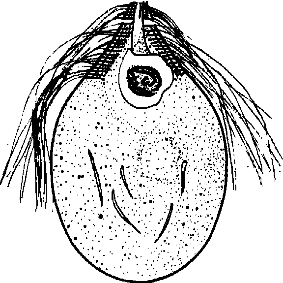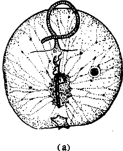 图 4 披发虫 寄生鱼类的鞭毛虫,常见的有两种。❶漂游口丝虫(Costia necatrix):体呈梨形; 有鞭毛4条,两长两短;寄生于淡水鱼的鳃及皮肤,对鱼苗、幼鱼危害最大。 ❷鳃隐鞭毛虫(Cryptobia brachialis):体呈柳叶状; 有鞭毛二条,一条游离,另一条自前向后,以波动膜与体表相连; 寄生于鲩等的鳃瓣,妨碍呼吸,致使鱼类死亡。 此外,超鞭毛目(Hypermastigina)的披发虫(Tri-chonympha),寄居在白蚁消化道内,能分解宿主消化道内的木质纤维素,与白蚁共生。如处死白蚁肠内的鞭毛虫,则白蚁不能消化木纤维而饿死(图4)。 |