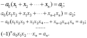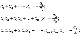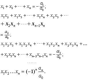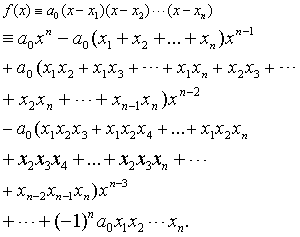 初中代数课本中所叙述的一元二次方程的根和系数的关系,就是上述定理当n=2时的特殊情况. 韦达定理的证明是以“一元n次方程在复数集里有且仅有n个根”这一重要定理为基础的,设一元n次方程 f(x)=a0xn+a1xn-1+…+an-1x+an=0(a0≠0) 的n个根为x1,x2,…,xn.则多项式