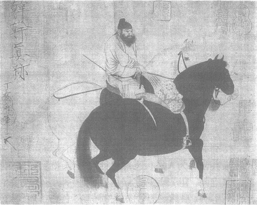 | 释义 | 韩干《牧马图》韩干以画马著称于世。《牧马图》便是其代表作之一。韩干画马的最大特点就是肥硕。唐代诗人杜甫认为 “干唯画肉不画骨,忍使骅骝气凋丧”; 而张彦远却说 “杜甫岂知画者,徒以干马肥大,遂有画肉之诮”。苏东坡更是明确地赞赏韩干画的马“肉中有骨”。从此卷中可见韩干用笔严谨,线条紧扣马匹结构,线的顿挫、刚柔结合马各部位的不同质感。如丰腴处线条饱满圆润,构成有力度的弧线,极富弹性。马蹄处的线条则坚挺劲利。马尾处的线则细劲柔软。此卷中马的姿态相对稳定。而起落有致的四足、微微前探的头颈,使人仿佛感觉到马的矫健的行进,听见马蹄杂踏的节奏。此卷在构图上独具匠心。背景空白无物,衬托出马匹的肥硕矫健的外形,突出了主题。前一匹马大面积的黑与马倌黑帽、白马上的黑鞍相呼应,马缰绳和马鞭用瘦劲的黑线穿插其中,与白马及空白背景相衬托,极富节奏感。韩干刻画人物也很成功。马倌那驾驭良驹的安然得意的神情溢于画表。