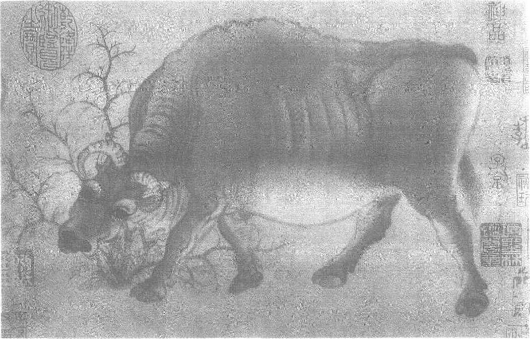 | 释义 | 韩滉《五牛图》长卷,纸本,设色。这是目前所见最早的画在纸上的国画作品。所画的五头牛各自独立,姿态各异。第一头似俯首吃草;第二头昂头嘶叫; 中间的 一头正对画面站立; 第四头扭颈舔舌; 第五头缓步行走。画家把牛健壮的体态、安详温和的气质刻画得极为传神。那枯淡干涩的线条紧扣牛的筋骨和肌肉; 加以淡色晕染,生动地表现出牛的毛皮的粗糙褶皱的质感。正中间那头正面的牛,透视关系非常准确,体现出作者深谙牛的形体结构和各种动态。更为可贵者,作者还通过对牛的不同姿态,以及牛眼睛、口舌等局部生动细致的刻画,把牛的那种憨厚、沉着、执拗、哀怨的性格传达了出来,同时也流露出作者本人对牛的深厚感情。