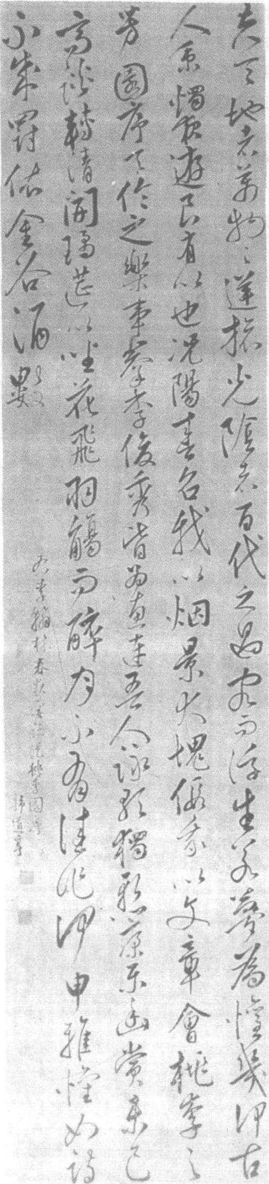 | 释义 | 韩道亨草书春夜宴诸从桃李园序轴明。纸本。纵145.3厘米,横32.9厘米。江苏省苏州博物馆藏。韩道亨,生卒不详,字颖泉,于草法的研究和教学方面颇有建树,草书宗法二王,法度严谨。万历四十一年,即公元1613年尝书《李白蜀道难卷》、《张君度补图。此幅草书运笔刚劲有力,结体宽闲疏朗,章法井然有序,体现了作者娴熟的书艺。