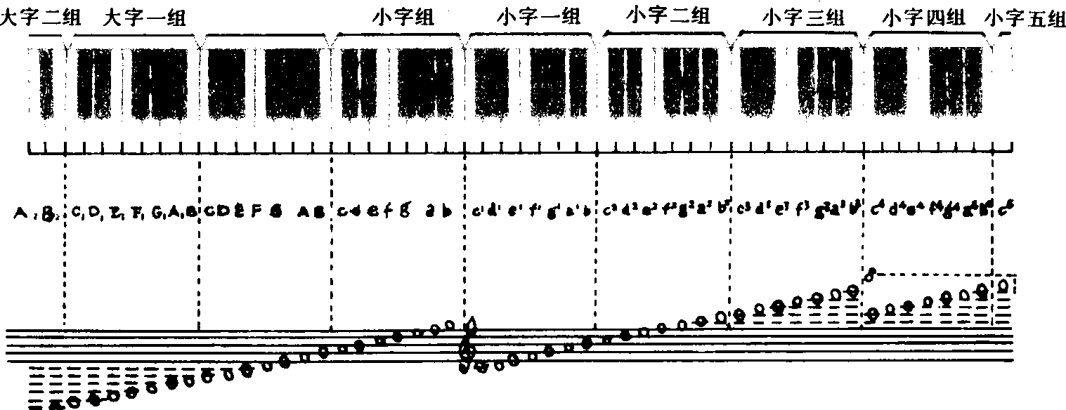 将音乐中所用的乐音,按上行或下行次序排列起来称音列。整个音列,是由12个不同的音(C、#C、D、#D、E、F、#F、G、#G、A、bB、♮B )及在高低不同的8度上的重复音构成。为互相有所区别,将音列划分为若干组,每组音名分别采用拉丁文的大写字母或小写字母及分组编号(记于字母右上、下角的数字)的方法,表明各组在音列中的固定位置及各音的固定高度(见音的分组图):