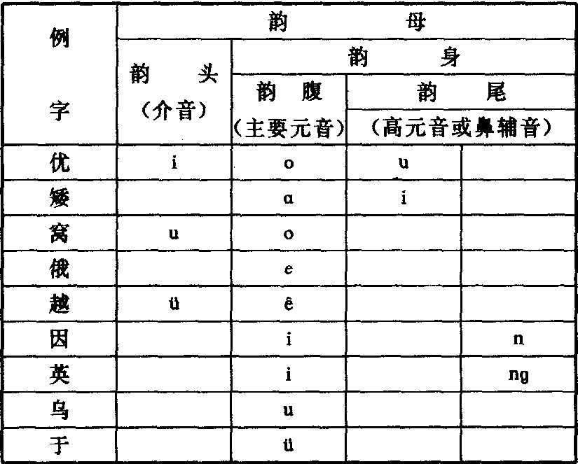 | 释义 | 韵母yunmu汉语音节中声母后面的部分,如“歌”ge中的e,“姐”jie中的ie,“黄”huang中的uang。 韵母结构表
